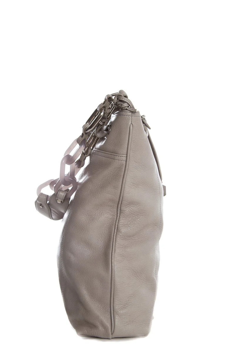 Balenciaga Cherche Gray leather tote with silver-tone hardware, dual chain-link and leather shoulder straps, dual exterior pockets; one with turn-lock closure featuring tonal stingray trim, tonal woven lining, single zip pocket at interior wall.