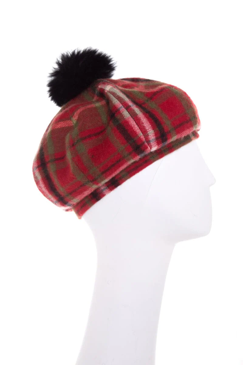 Burberry Cashmere Nova Check Pattern Beret With Fox Fur Pom Pom. This item is in very good condition.