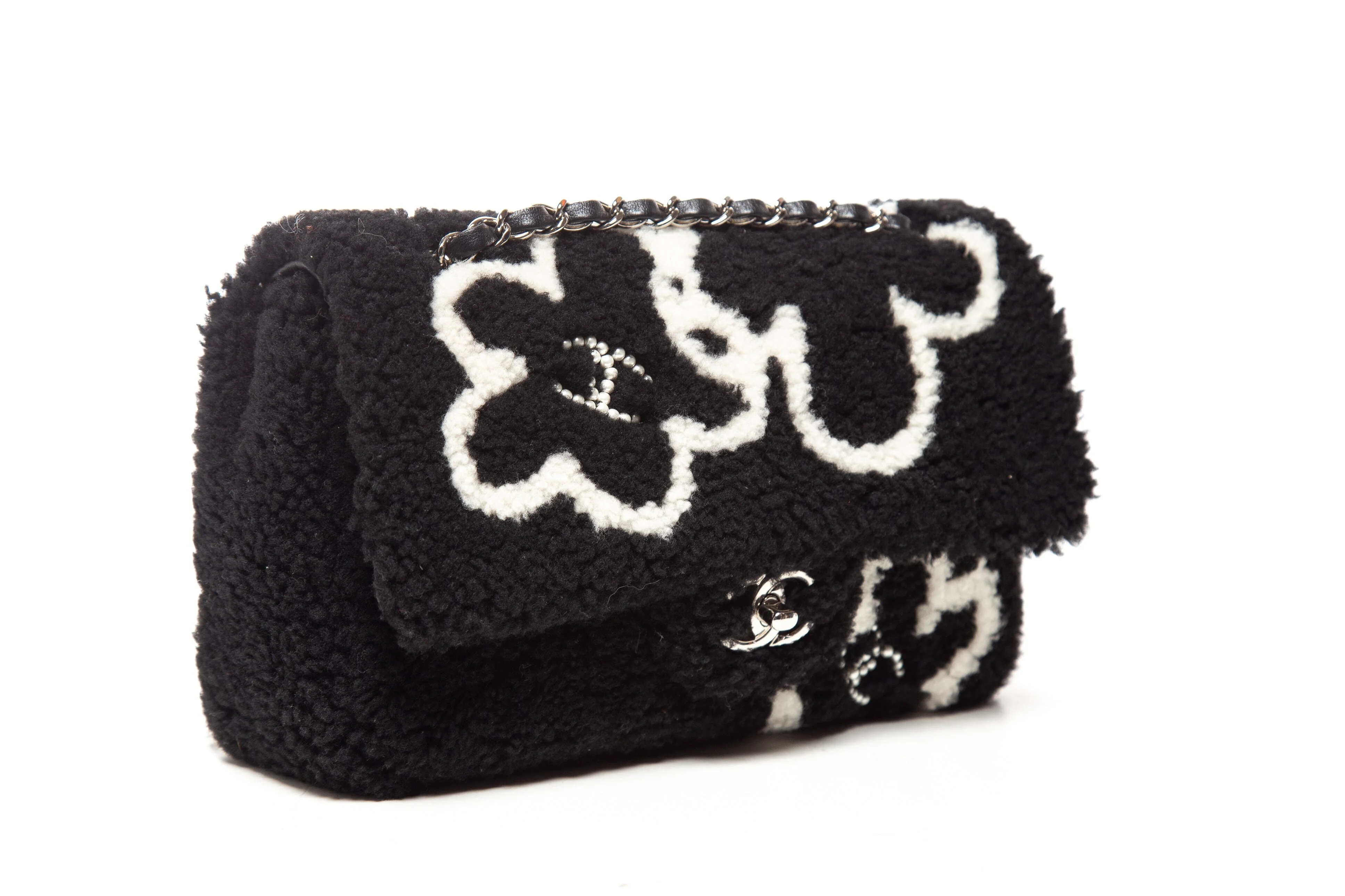 Chanel '22-23 Black and White Shearling Camellia Single Flap Bag