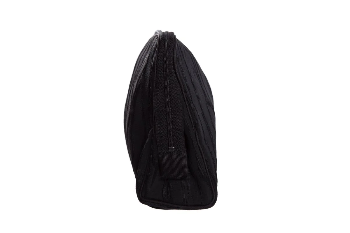 Black satin Christian Dior vintage pouch with gold-tone hardware, zip closure at top, and featuring dual slip pockets at the interior. This item is in good condition.