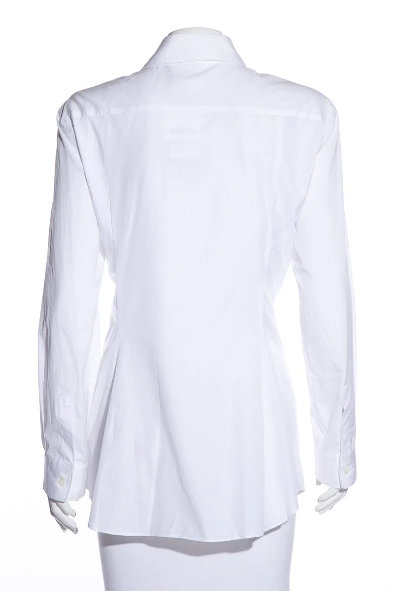 Comme des Garcons white blouse with tie details. This item is new with tags and does not contain any signs of wear or imperfections.