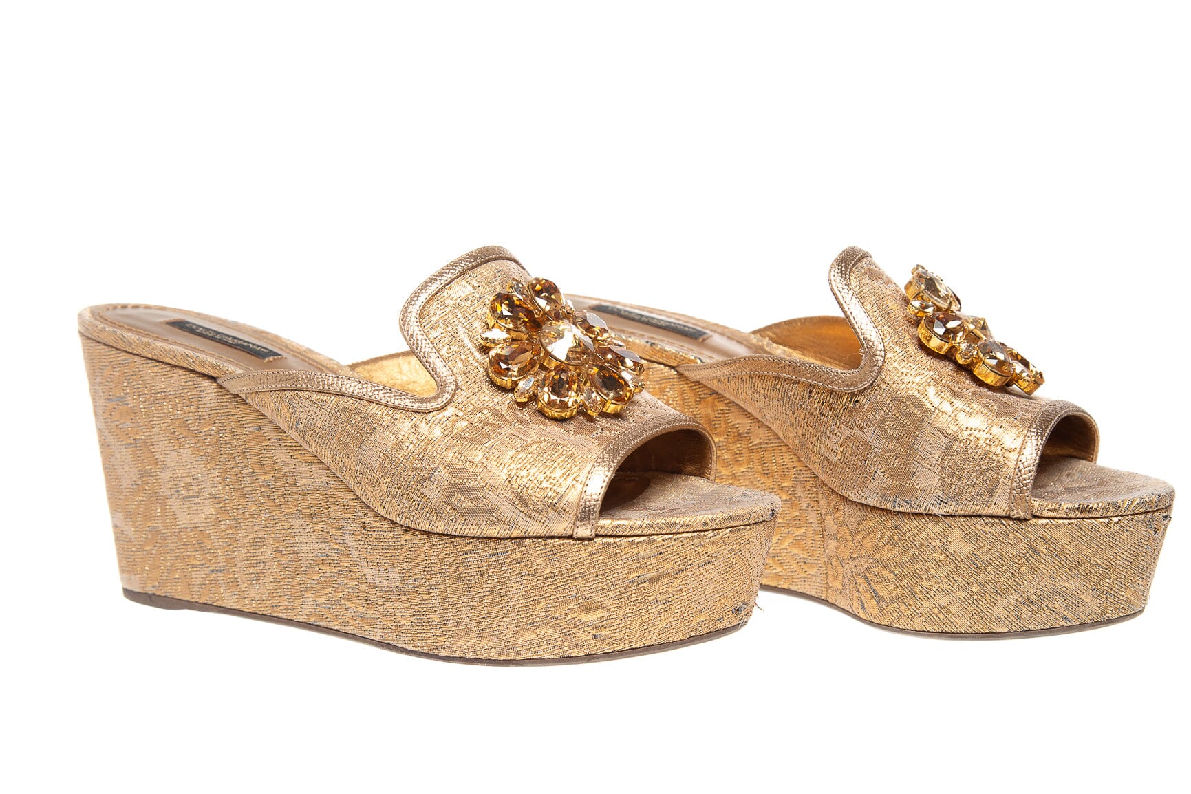 Dolce & Gabbana Gold Jacquard Wedge with Stone Front. This item is in good condition; some wear on fabric exterior.