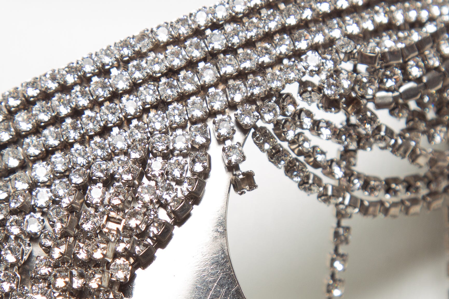 White leather clutch with fringe rhinestone handle. This item is in good condition; slight discoloration on back panel as well as one broken crystal strand.