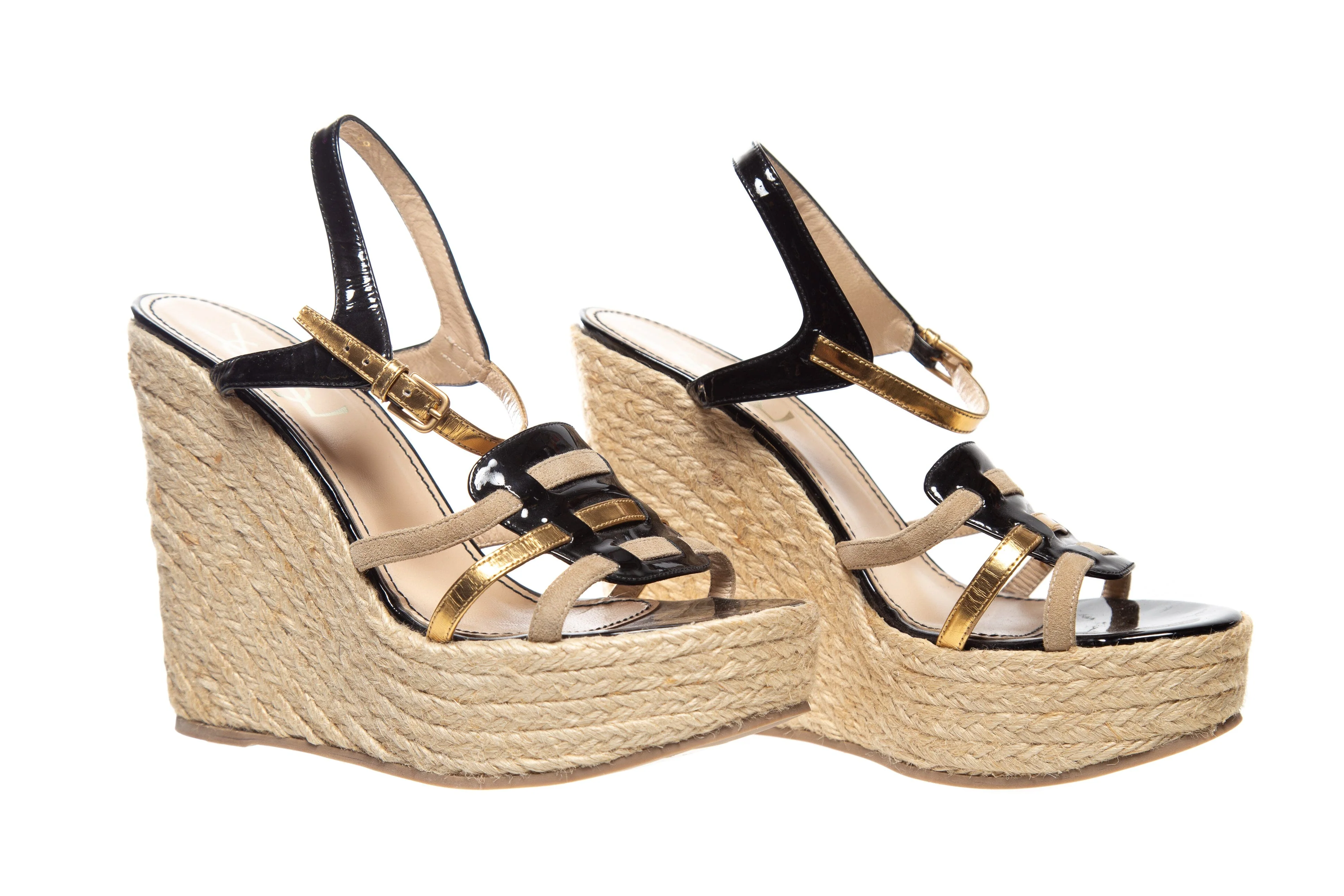 Yves Saint Laurent Black Patent LeatherĀ Multi Strap Espadrille Wedge. This item is in very good condition.